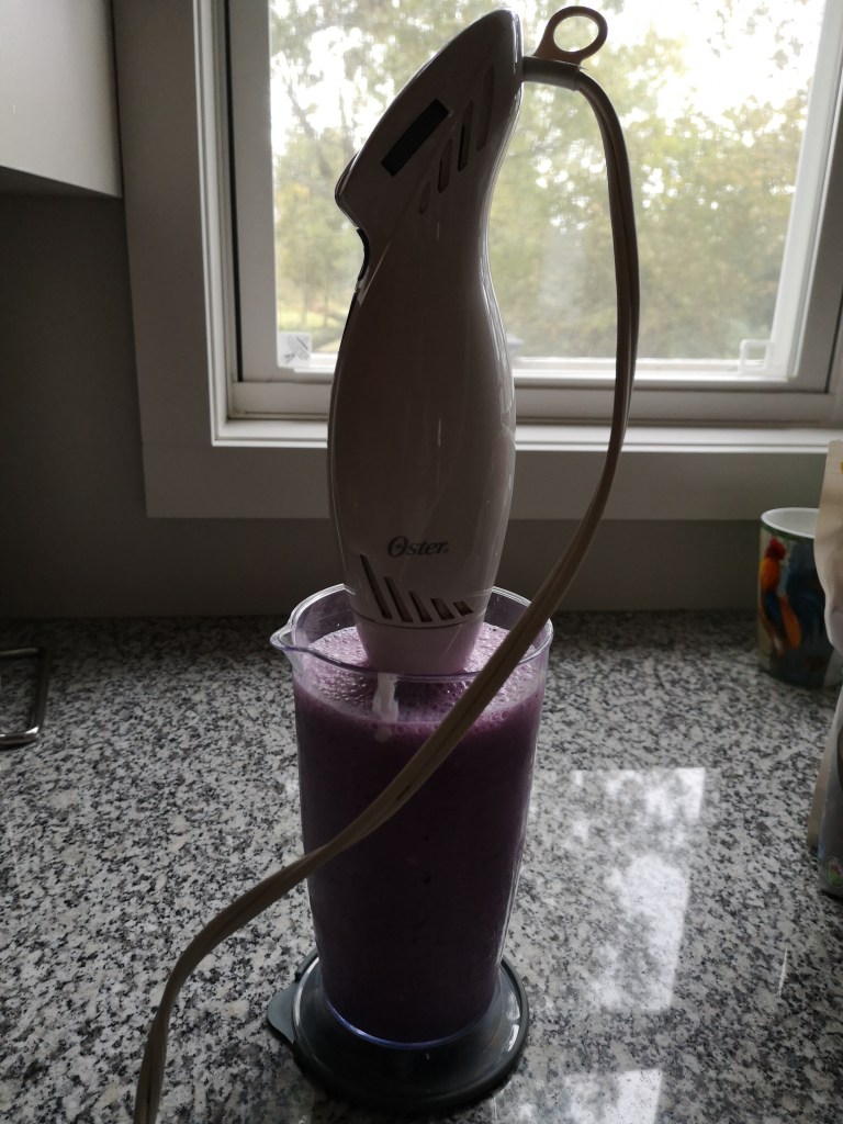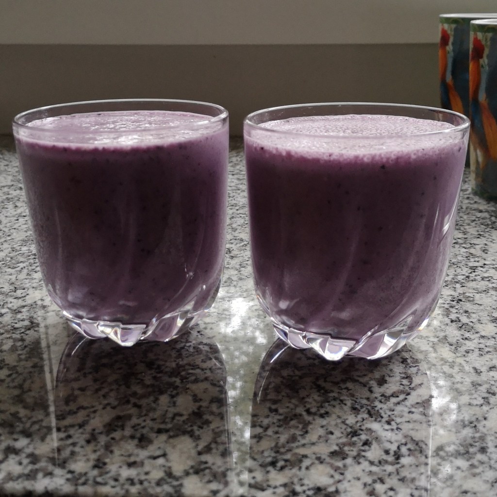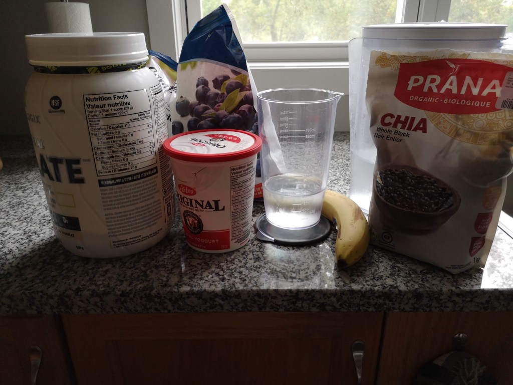 200 ml water, 1 banana, 1/2 cup plain unsweetened yogurt, 2/3cup frozen wild blueberries, 2 scoops protein powder. Blend add 2T chia seeds.