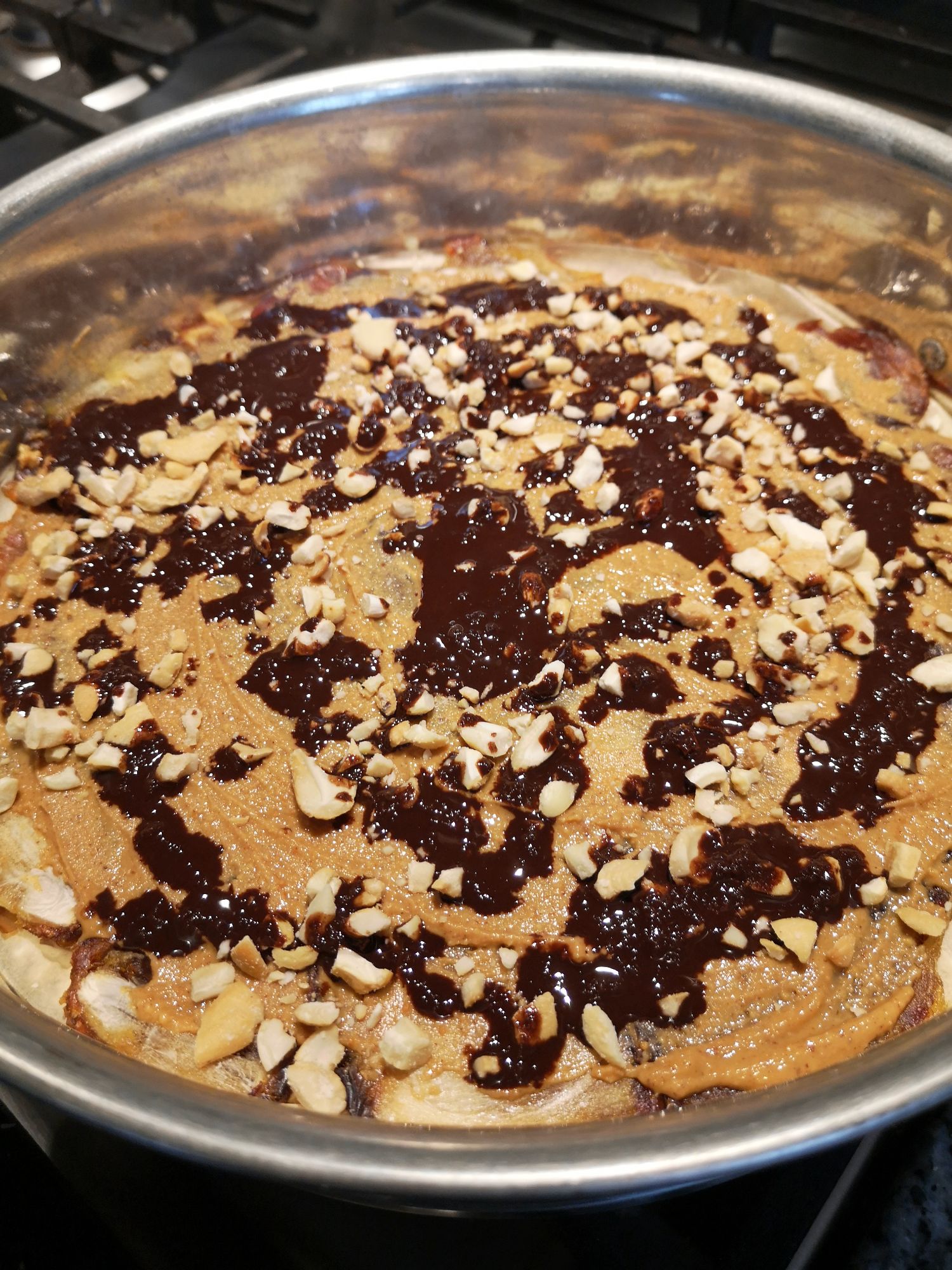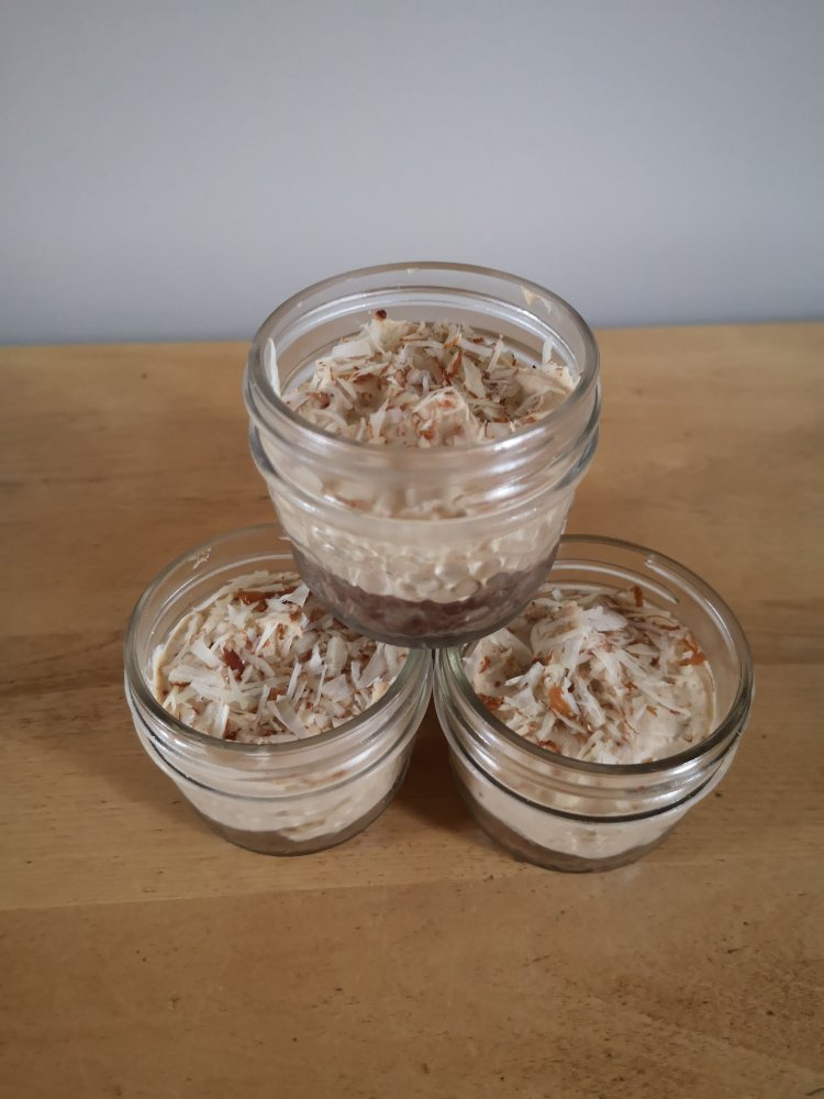 3rd option (See photos below)This one I have just tried and used recently. Can be done in jars as above or in a spring for pan. If doing in jars I make and cut into small squares and put pieces on bottom,(just drop in) the filling will sink in and around. Using 8-10 large soft medjool dates, remove pits, and place flat on wax or parchment paper. Put another piece on top, and with a rolling pin roll out to form 1 solid piece of date. Spread thinly with natural peanut butter, sprinkle with crushed nuts (optional) I have been using cashews, and drizzle with Make your own Chocolate (only need to make 1/2 the amount of this recipe). Save what is left of chocolate to put on top of cheesecakes. Place your date crust in freezer while making filling. When ready, remove, and using a pizza wheel or sharp knife cut into small pieces. Drop into bottom of jars, top with filling. Refrigerate till firm (approx. 1 hr.) To remaining chocolate (may need to warm slightly to blend) add 2 Tbsp. of milk and whisk together. Divide chocolate between jars and sprinkle with crushed nuts.
