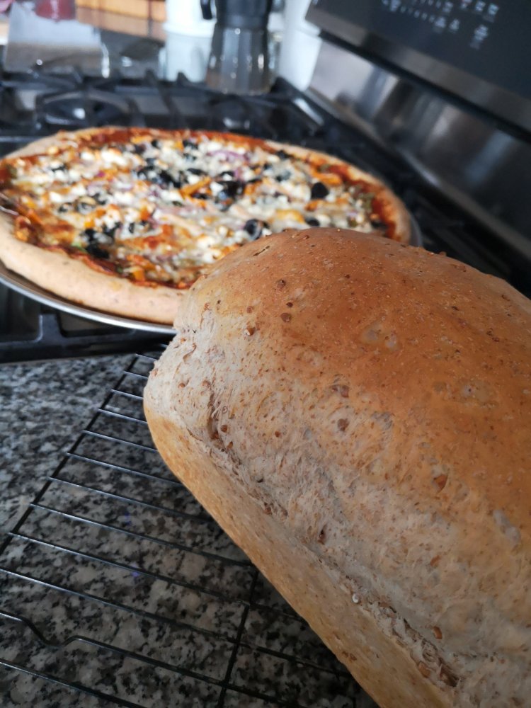 This dough is great for bread, rolls or pizza dough. Makes 3 loaves of bread or 2 loaves and 1 large pizza crust. You can store dough in fridge until ready to make pizza. Remove from fridge approx 1 hr before using.