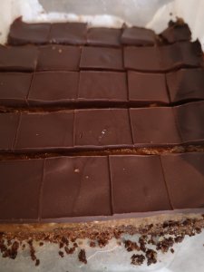 Place all ingredients in glass microwave safe dish and heat in microwave on high for 30 seconds. Stir and then heat at 10 second intervals until melted. Spread on top of caramel. Refrigerate for 15 – 20 minutes to allow chocolate to start to set. Remove and score through chocolate before it gets too hard, cutting into small bite size squares. Store in fridge. Great snack for those sweet cravings.