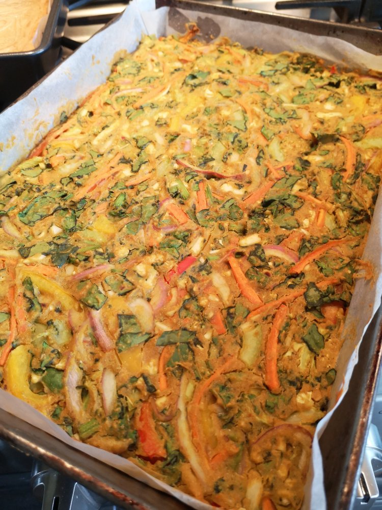 This pakora recipe is a take off from an original recipe that I love. Normally I would just spend extra time frying these in oil about 1″ deep in a pan doing about 4 to 5 at a time. But I have decided to forgo the long process of frying them and press the whole works into a baking dish and bake. This is also a healthier method of cooking and allows for the flavor of the vegetables to intensify through the process of baking. This worked out great and I will never deep fry pakora again.